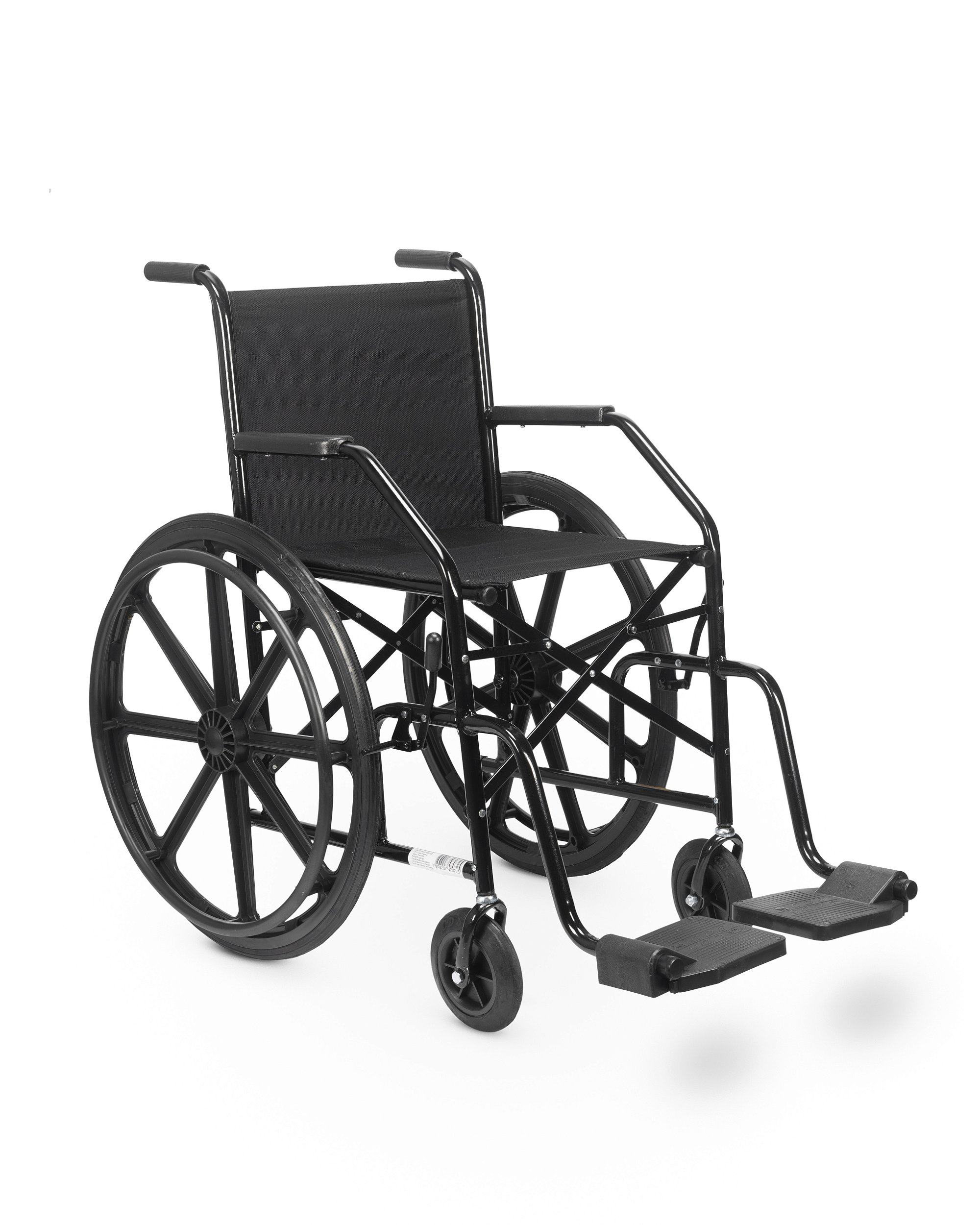 Estrutura tubular em aço carbono, pintura epóxi, dobrável em X, assento/encosto em nylon, apoio para braços fixos, apoio para pésfixos, freios bilaterais, aro impulsor bilateral, rodas dianteiras aro 06′′ com pneus maciços e rodas traseiras aro 24′′ em nylon compneus maciços ou infláveis.
